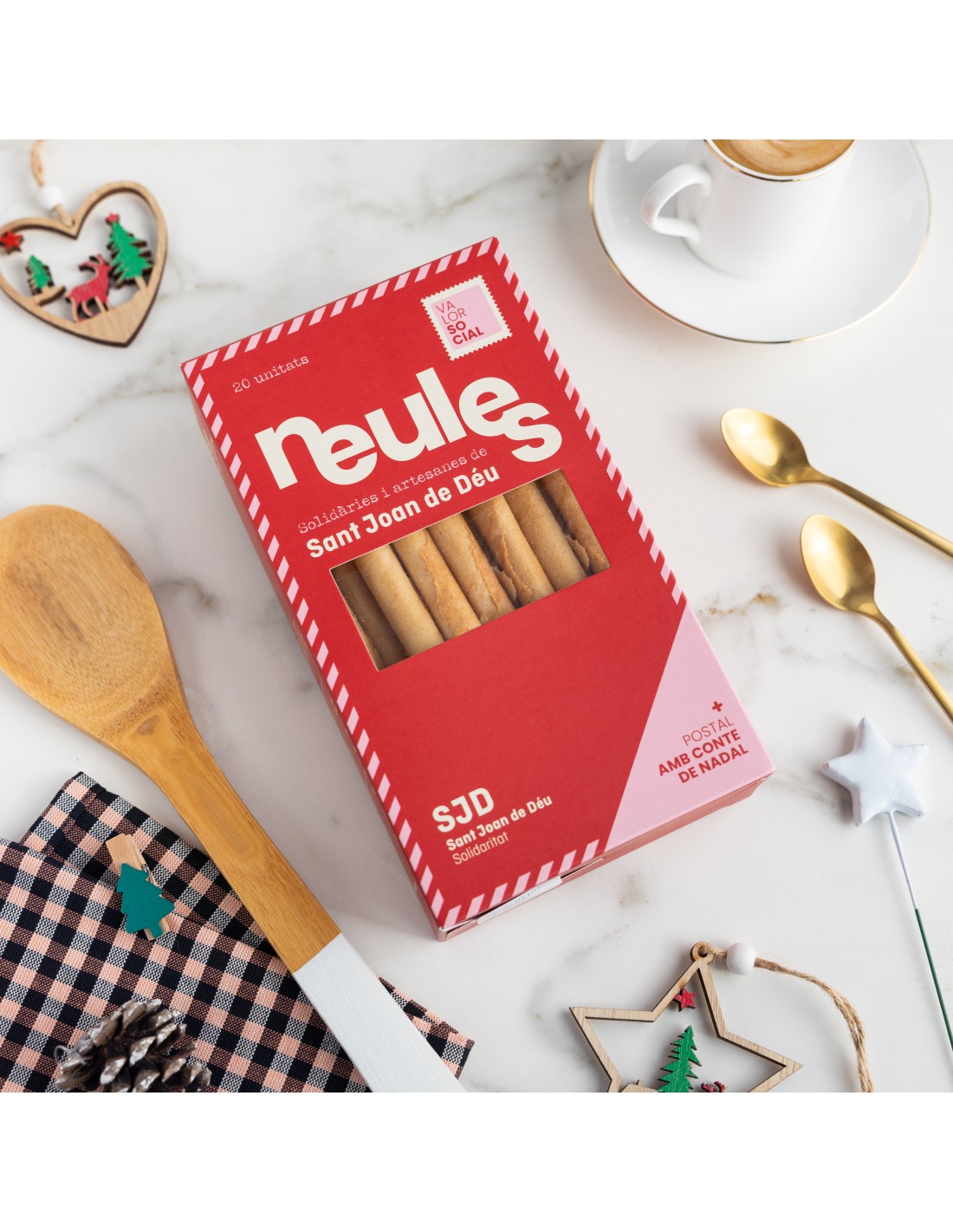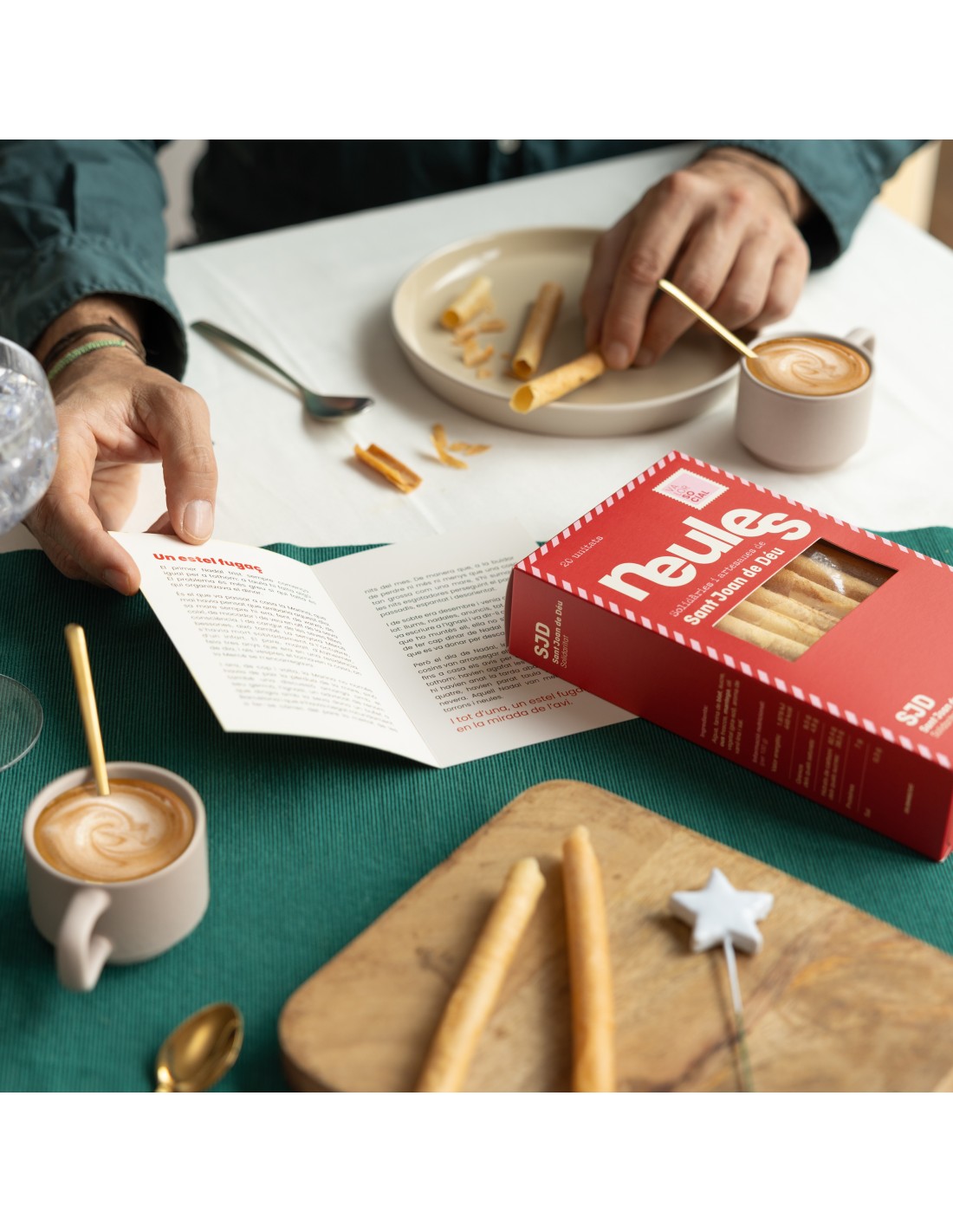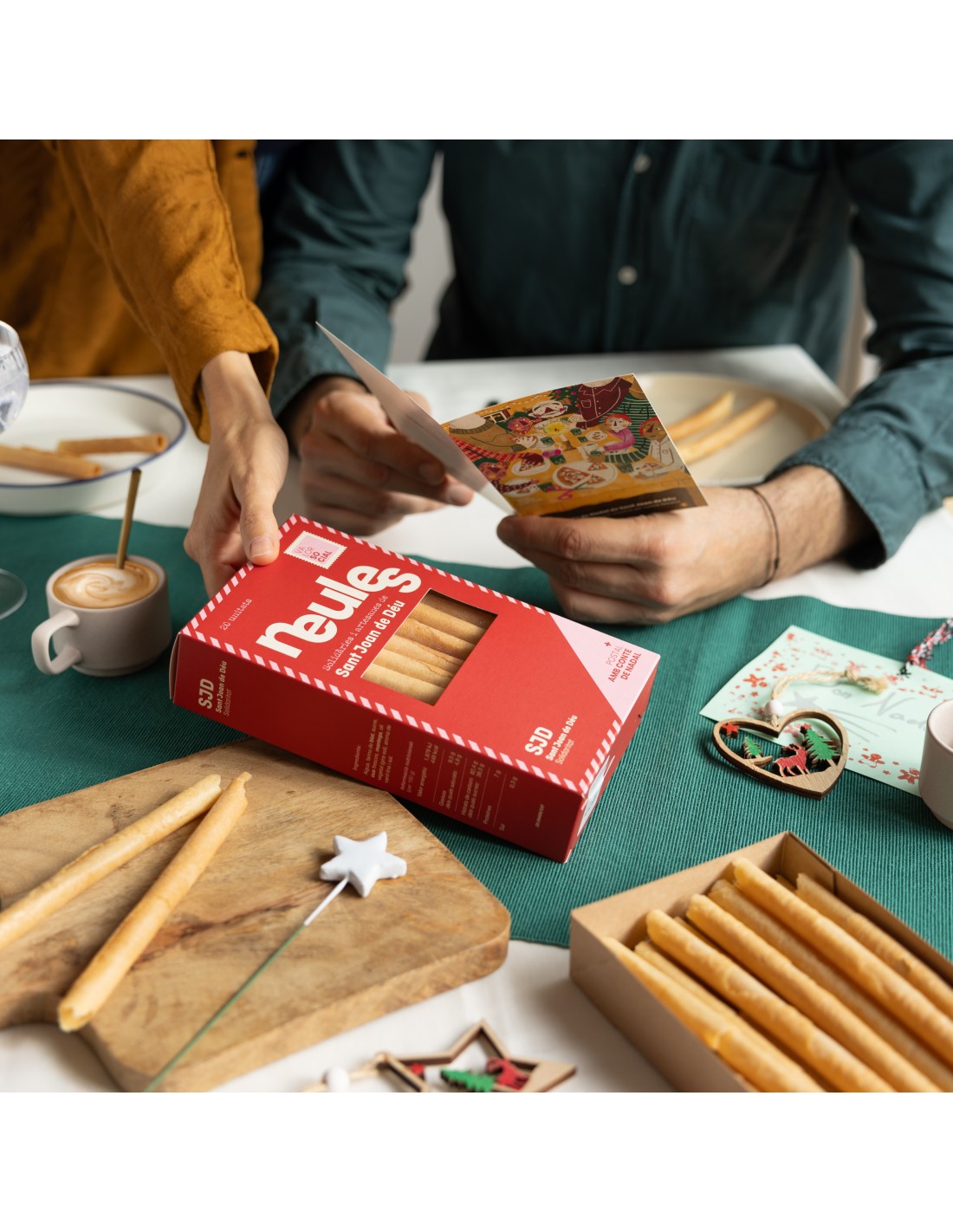 Barquillos artesanales acompañados de una postal ilustrada con un cuento de Navidad.